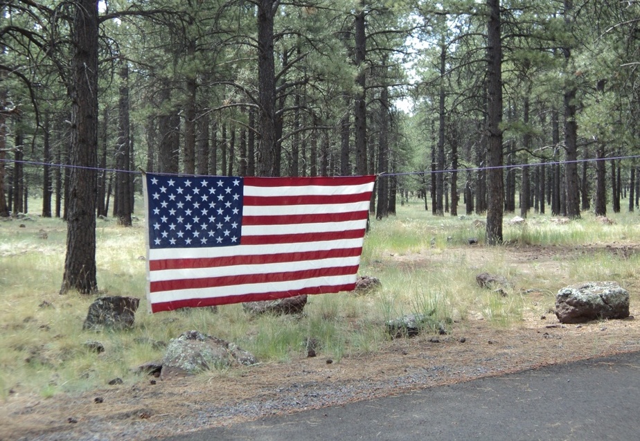 Though we technically camped on a paved road, we were happy about our setup. Tons of space around us to spread out. Plenty of room for the dog run. And exceptional real estate for putting up our over-sized American flag . . .