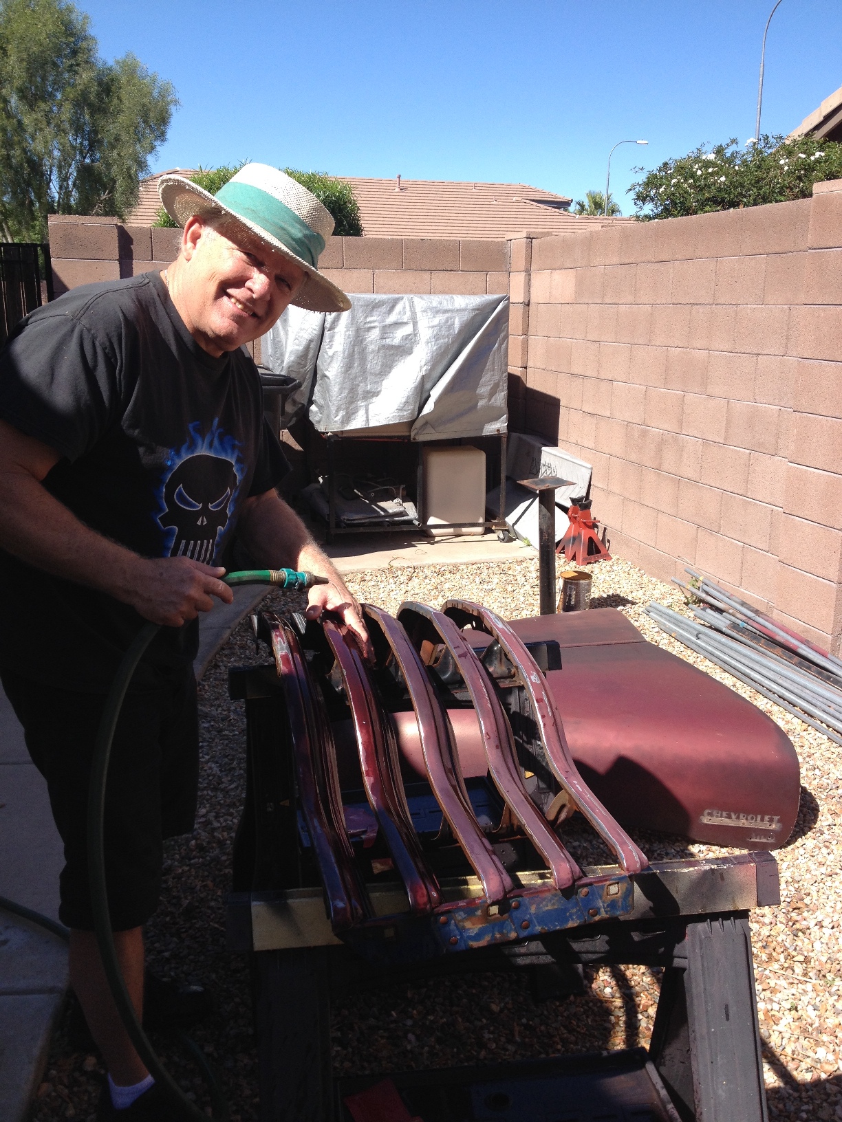 Next, Mark will paint the underside of the hood, so we can reattach that as well. (Yeah, this is the rare occasion where I can say ‘we’ . . . I’ve redeemed myself on occasion by at least being of help lifting the bed off the chassis, or lifting the hood or fenders when needed. <“Right, honey?”>)