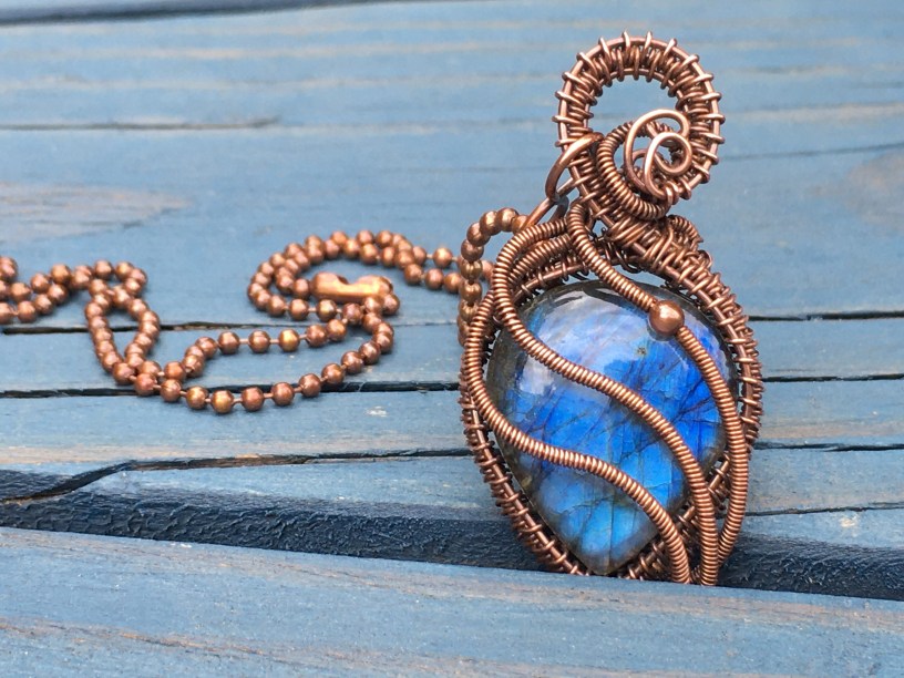 I now dabble a lot in wire wrapping, wire weaving, and wire forming. I do most of my wire working in raw copper, brass, or jewelers’ bronze right now (fine silver and sterling silver in the near future), and may also use stainless steel, surgical steel or .925 sterling silver for ear wires or other components. I’m also occasionally using sheet metals for cutting, forming, doing soldering or cold joins (rivets) but the learning curve is long, especially because I’m self-teaching on all of this, which also eats up a lot of my time. (Not complaining! It’s just reality.)
